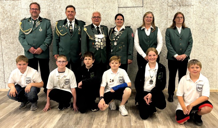 Vordere Reihe: Til Mangels (1. Ritter Jungschützen), Levin Harten (Jungschützenkönig), Finn Fischer (2. Ritter Jungschützen), Timo Neutzsch (2. Ritter Schüler), Lina Müller (Schülerkönigin),