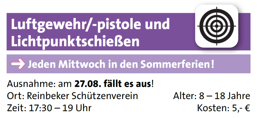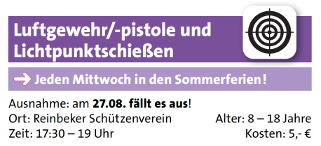 Während der Sommerferien in Schleswig-Holstein vom 28. Juli bis zum 06. September veranstaltet der Reinbeker Schützenverein wieder ein Ferienprogramm. Interessierte Jugendliche im Alter zwischen 8 und 18 Jahren können jeden Mittwoch, bis auf den 27. August, ohne Anmeldung um 17:30 Uhr in die Loddenallee 4 in den Schützenverein kommen.